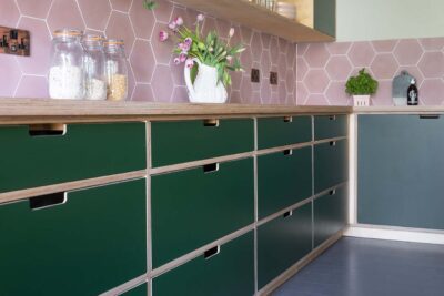 Our luxury modern kitchen designs are durable and sustainable. We tend to use high-quality 18mm FSC birch plywood for cabinets but you can choose from a wide variety of materials to suit your style. Our team builds our bespoke fitted kitchens from reclaimed oak and innovative modern materials, such as Forbo and Valchromat. Depending on your chosen finish, we use environmentally friendly paints and oils to seal surfaces.