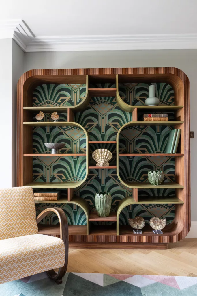 We designed and built this bespoke Art Deco style home library using fluted walnut paneling that emphasises vertical elegance, paired with liquid brass spray accents that shimmer like vintage gilding. Throughout, we incorporated hand-curved shelves that sweep gently into corners, offering both grandeur and utility. The shelves’ curves are complemented by rich Art Deco wallpaper that frames the space, giving warmth and period-appropriate texture. Solid brass handles lend weight and authenticity to the cabinetry, while deep, tailored shelving ensures every book, object and treasure is beautifully displayed.