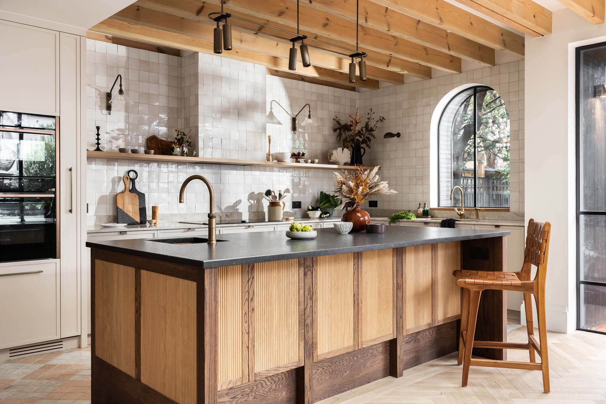 The modern black kitchen design is softened by the use of honey-toned reclaimed oak throughout. As always, this kitchen was about balancing the aesthetics with lifestyle and practical details. We added a tiered island unit, open shelving and twisted drawer pulls as well as LED lighting underneath the upper cabinets.