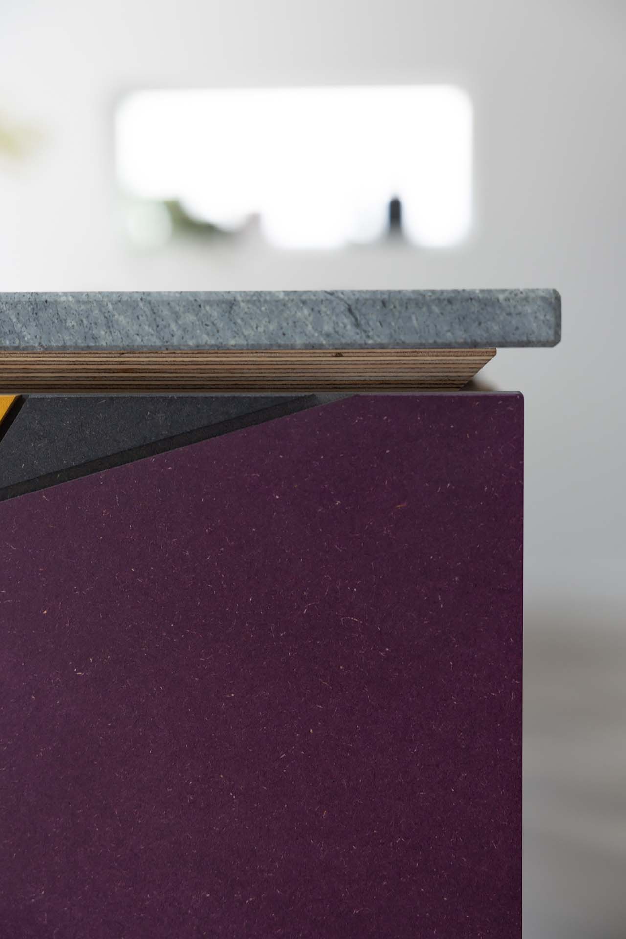 Valchromat is an ideal material for this geometric kitchen design. It is an innovative coloured wood fibre product. The fibres are individually impregnated with organic dyes and bonded by purpose-made resins. The panels are engineered for high physical performance and durability.