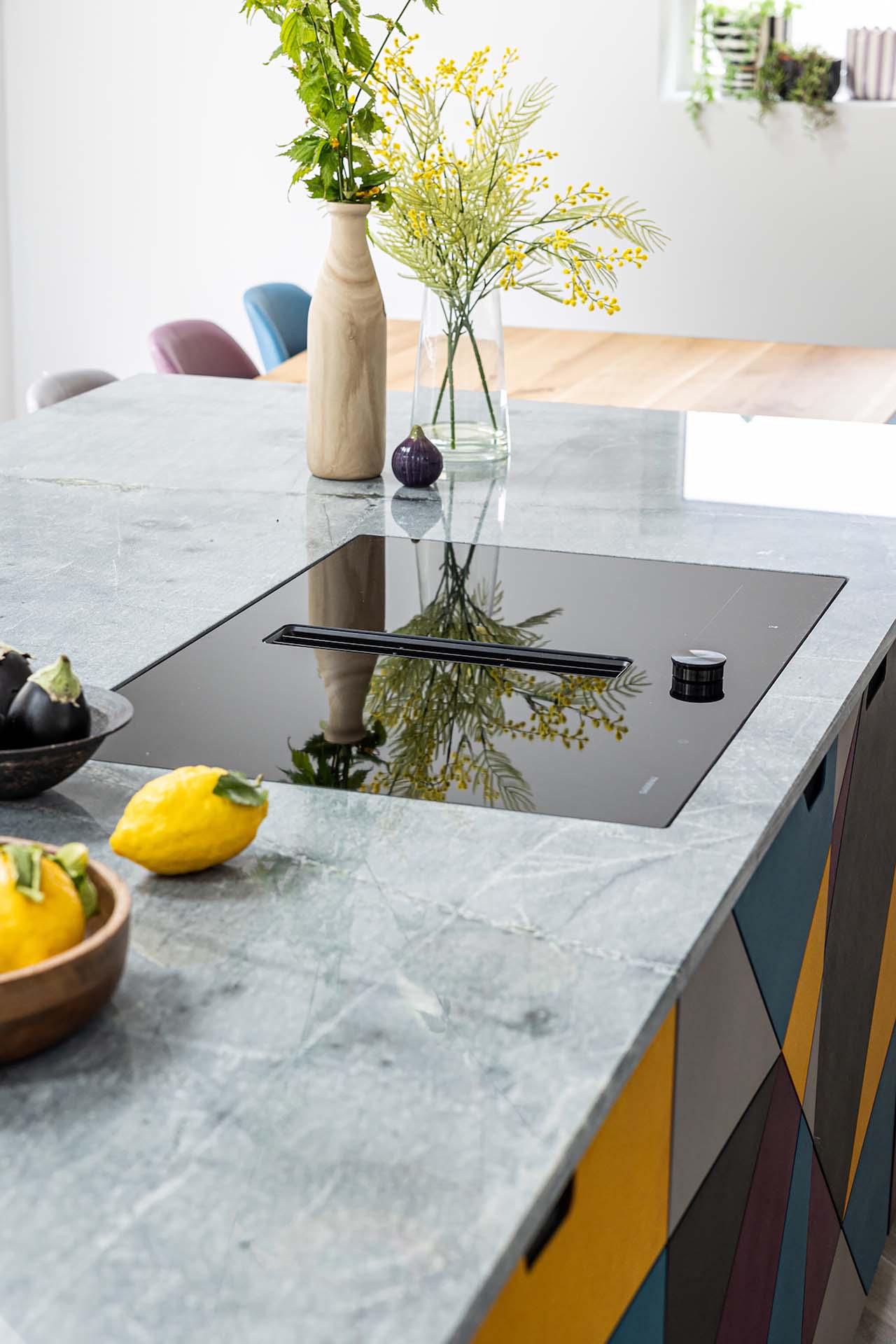 A gorgeous soft grey veined granite worktop pulls everything together in this bright and geometric kitchen design. - A sociable space