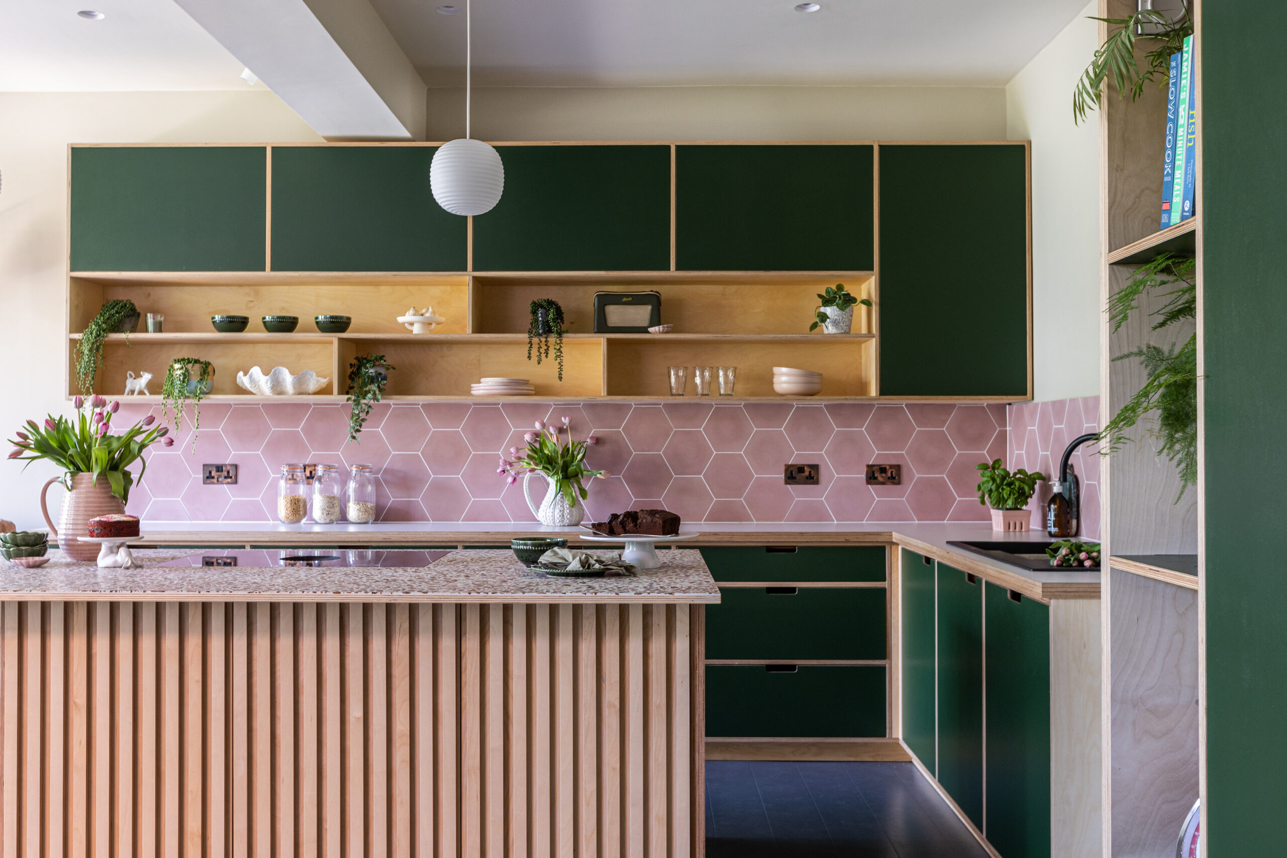 We love the dark forest green plywood kitchen units and how they contrast with the soft pink of the tiled backsplash. - Organic accents