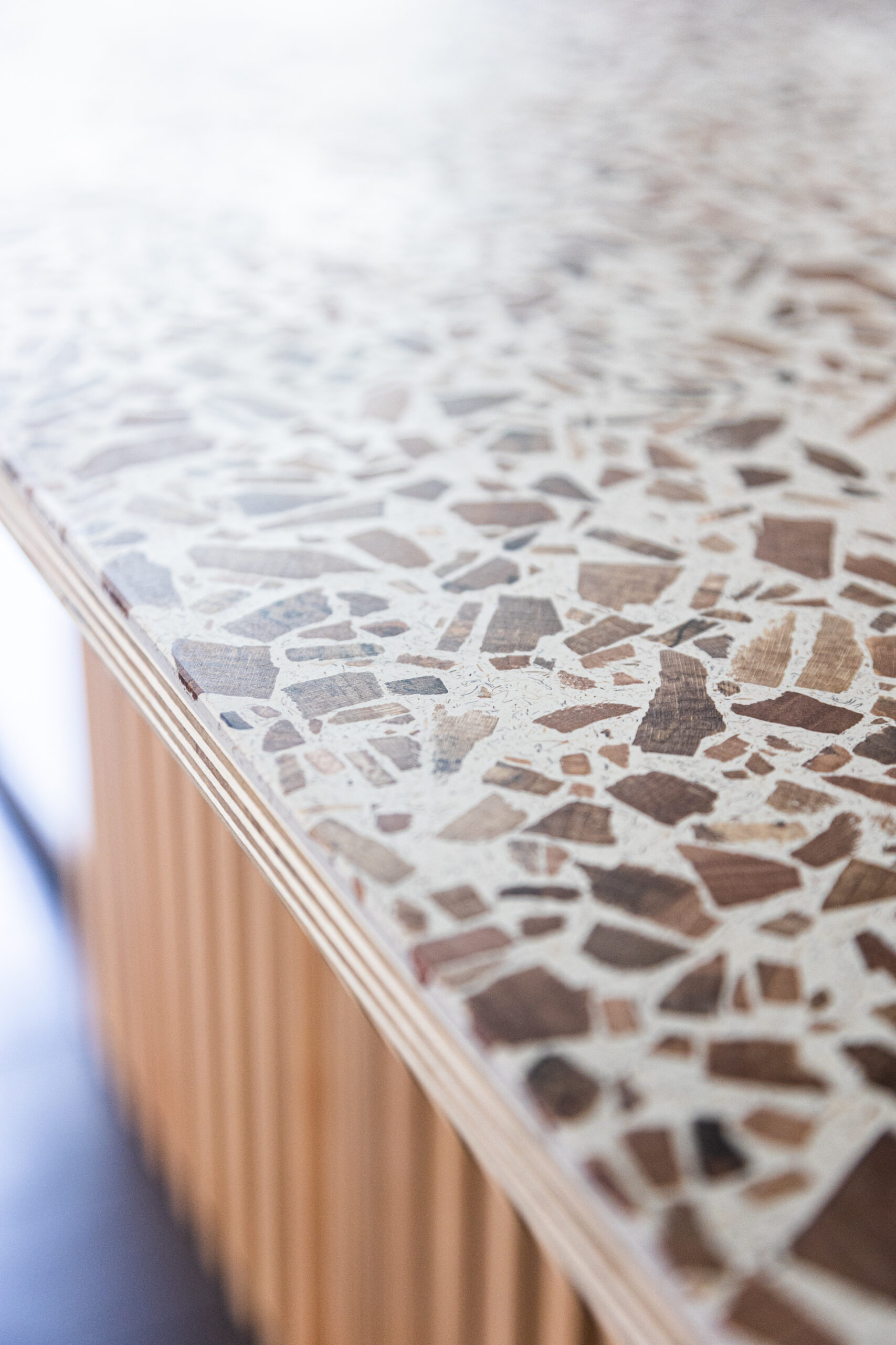 The addition of ‘hit and miss’ ply and Foresso – with its wood texture – on the island is really powerful. - All about the storage