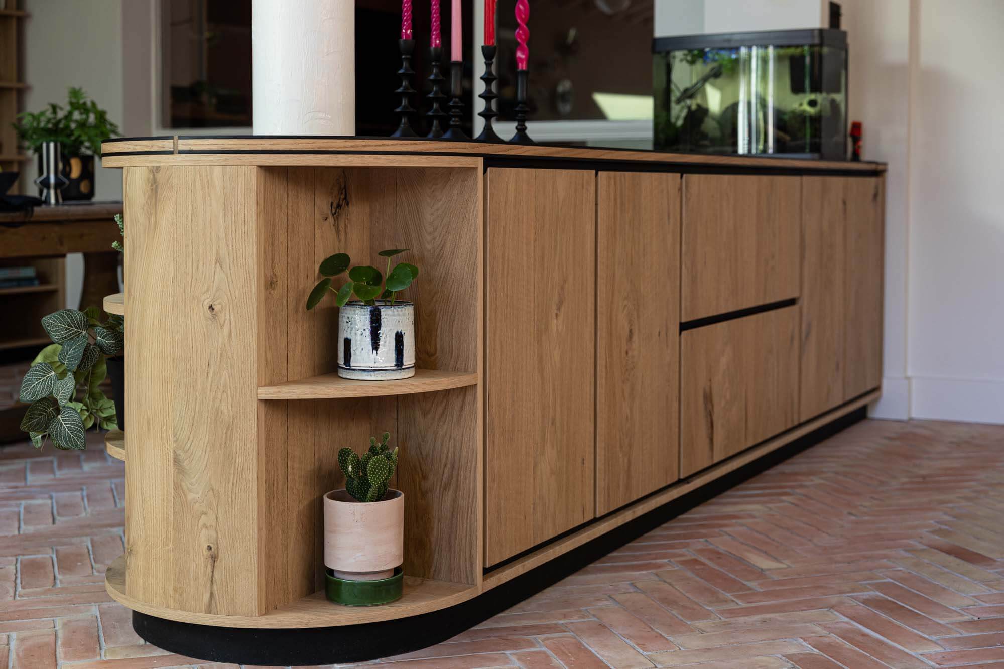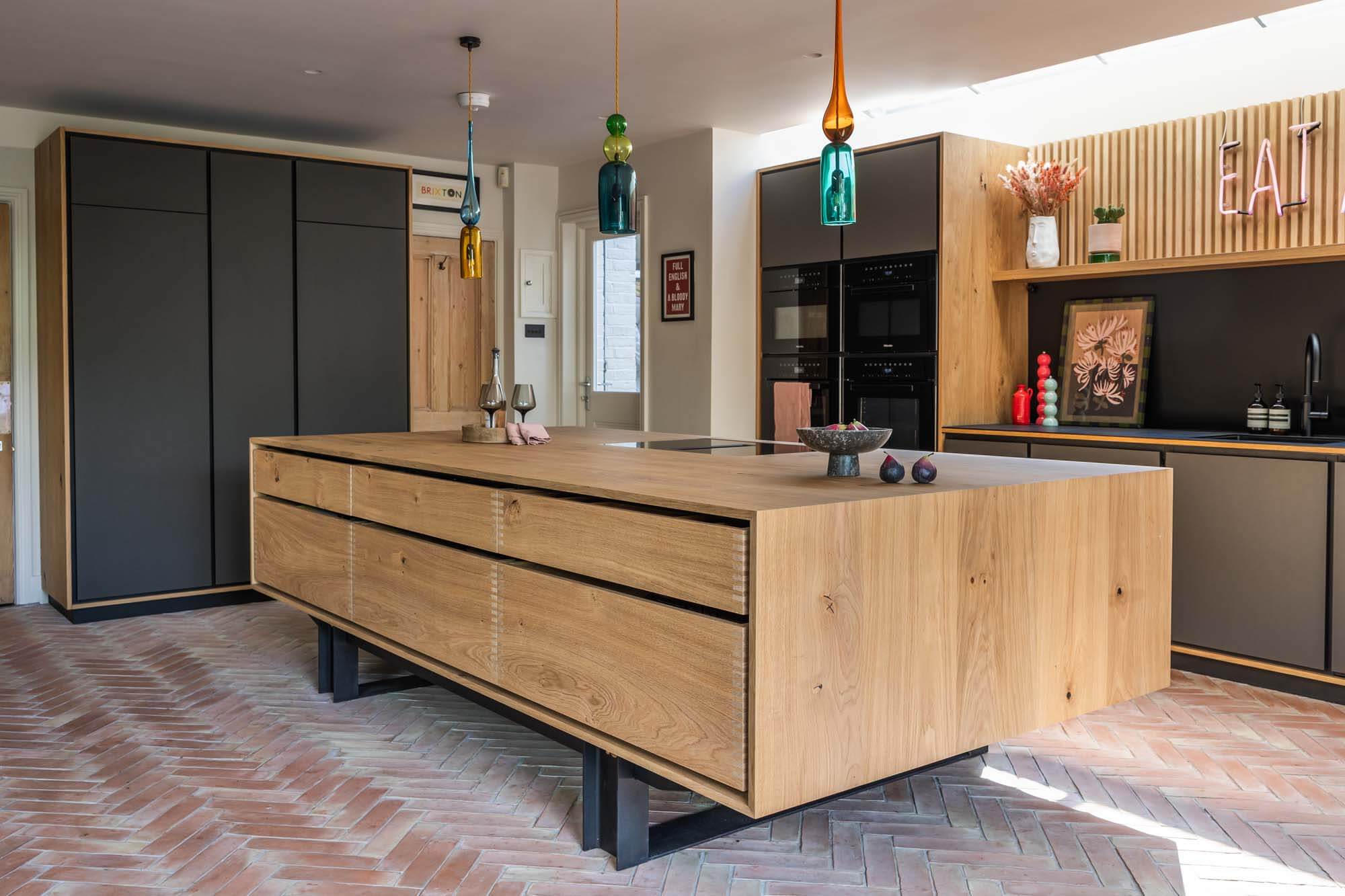 At Woodworks Brighton, we designed and hand-crafted a striking kitchen with a strong focus on architectural detailing, natural materials, and traditional joinery. The heart of the space is a solid oak floating island, supported by raw metal RSJ steel legs. This island features hand-crafted box joint drawers—a celebration of time-honoured craftsmanship elevated with a modern, industrial edge.