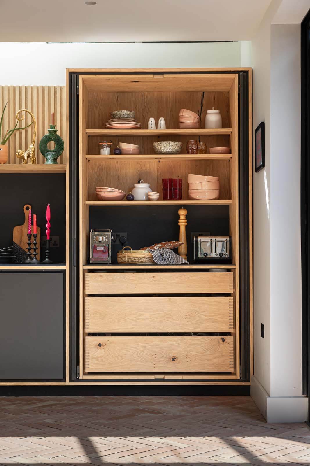 - Features – Handmade box joint drawers | RSJ steel legs | Concealed pantry storage
