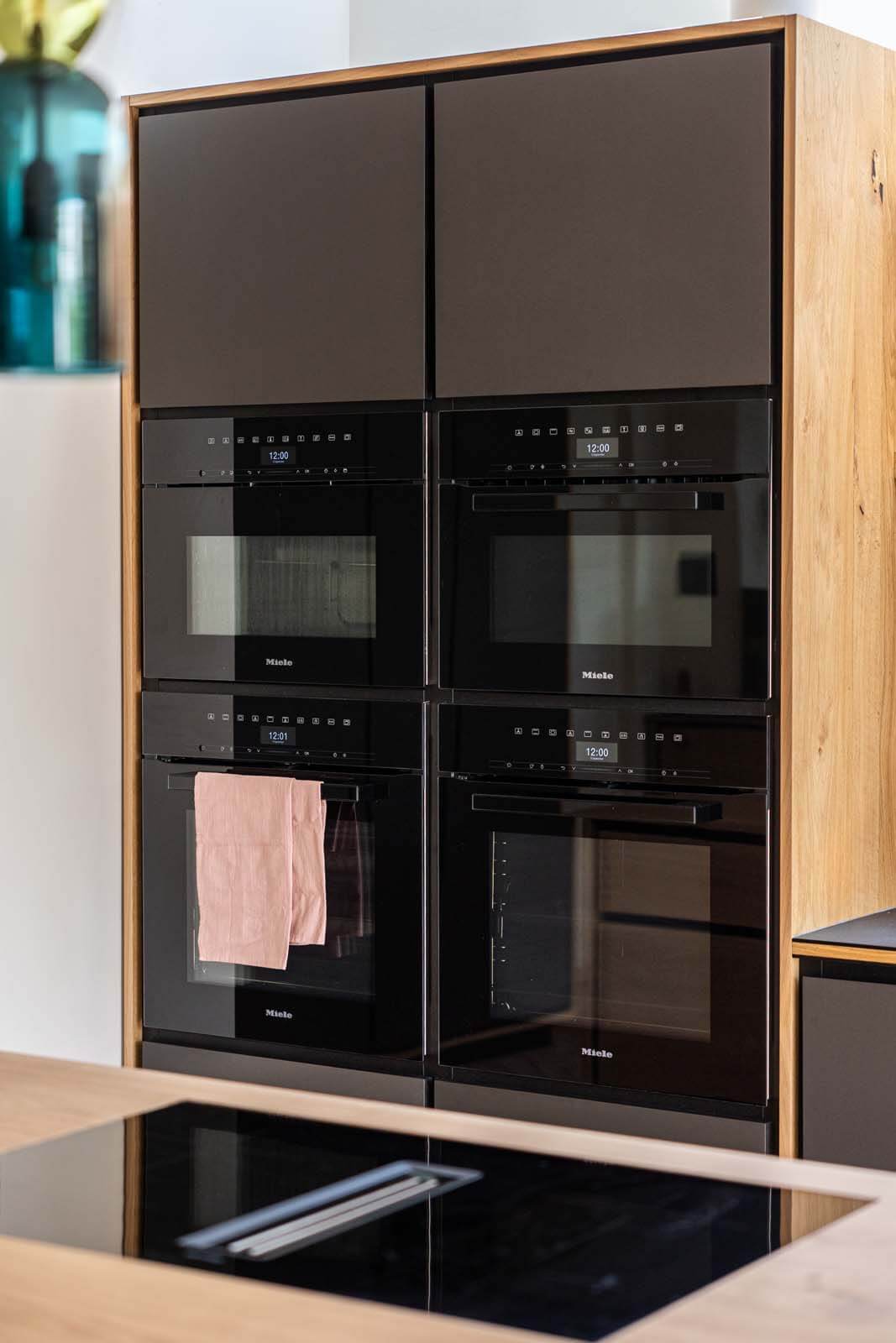 The surrounding cabinetry is made from black Valchromat, finished with bespoke Forbostyle fronts for a refined and contemporary look. To maximise functionality, we incorporated a pair of double slide-and-hide pantry doors, offering generous and concealed storage while maintaining clean lines and uncluttered surfaces.
