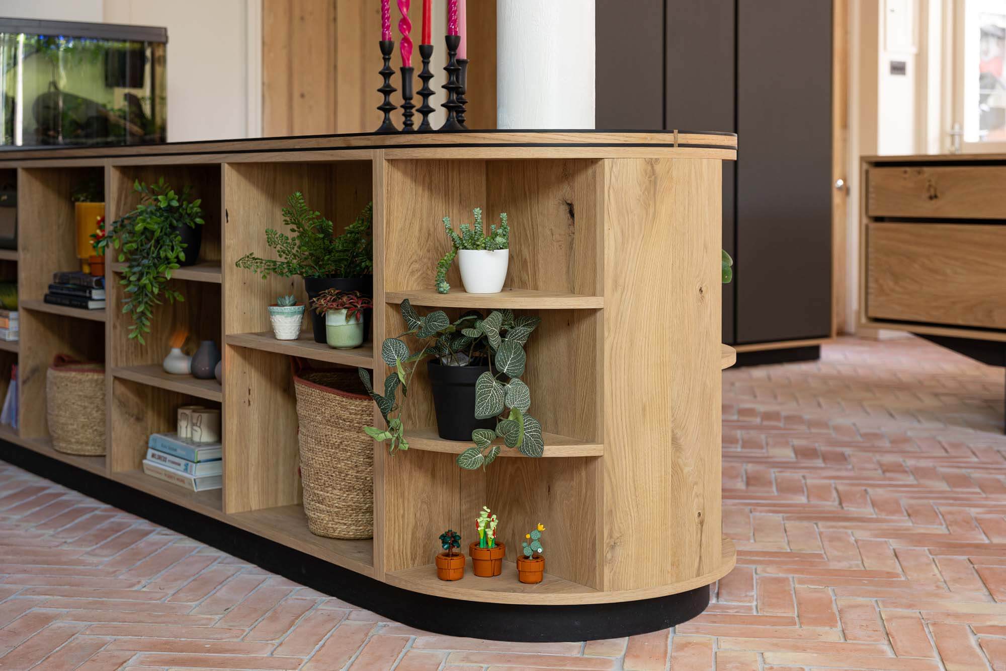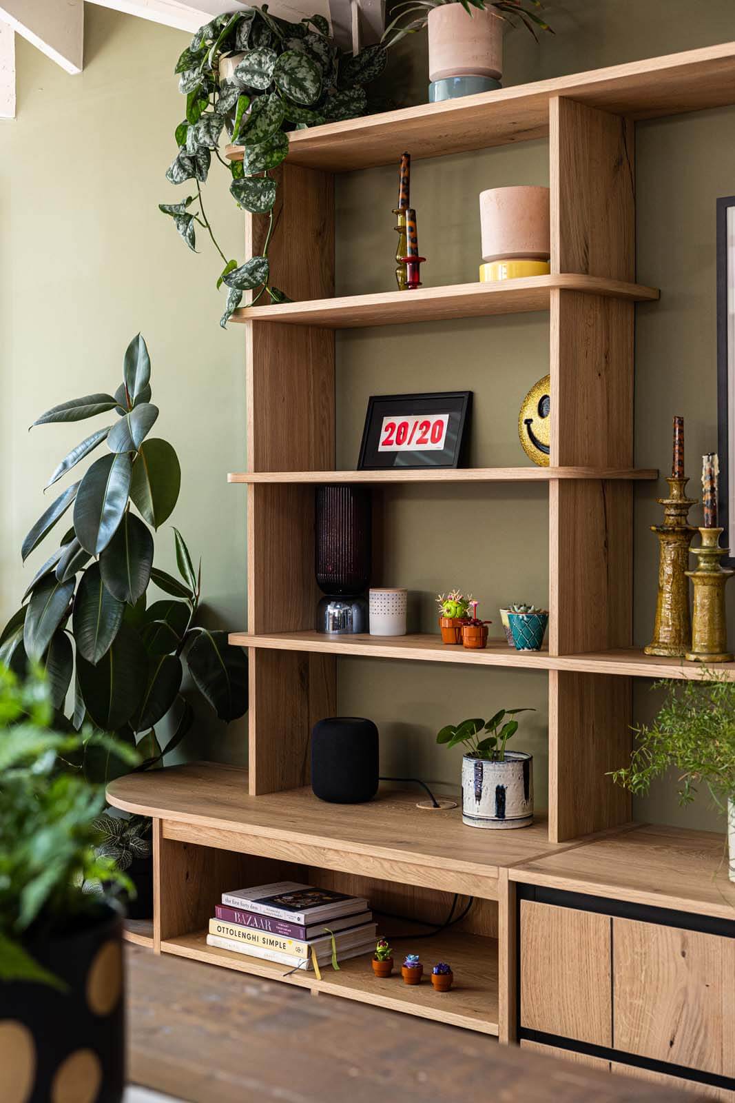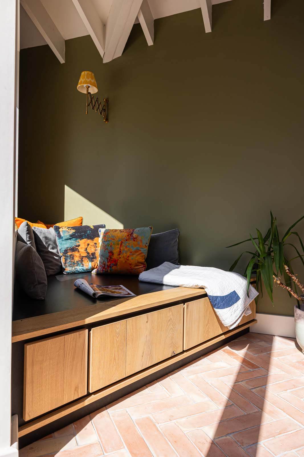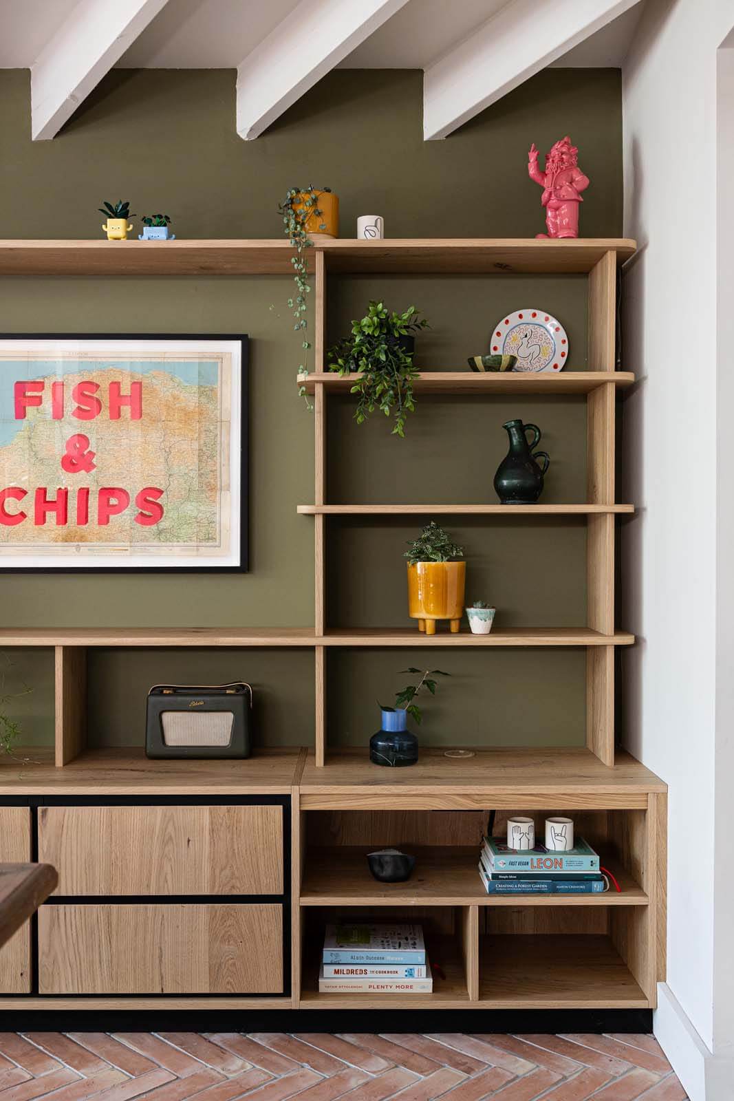 Alongside the handmade kitchen, we also designed and built a stylish bespoke peninsular that cleverly incorporates an awkwardly positioned post. This feature not only resolved a tricky structural detail but also creates a natural divide between the kitchen and a cosy seating, playing, and reading nook. To make the most of the space, we added custombuilt shelves, offering both storage and display opportunities, perfectly tailored to the family’s lifestyle.