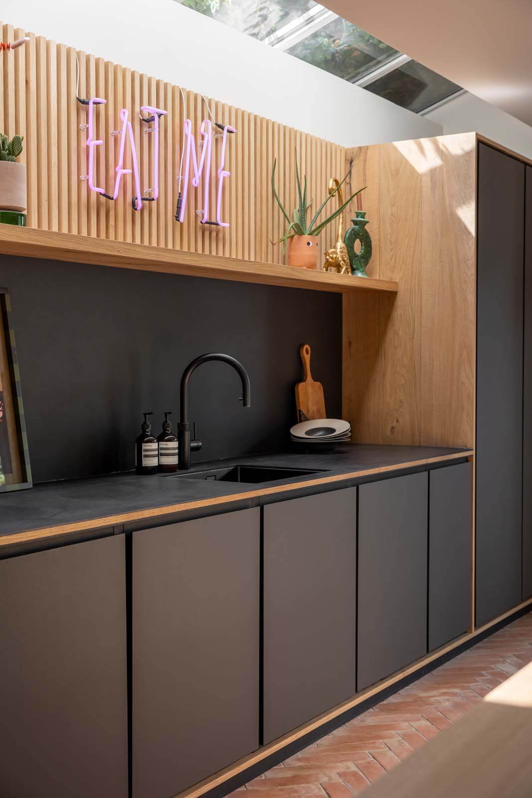 - Black diamond Richlite worktop with integrated sink—sustainable and striking