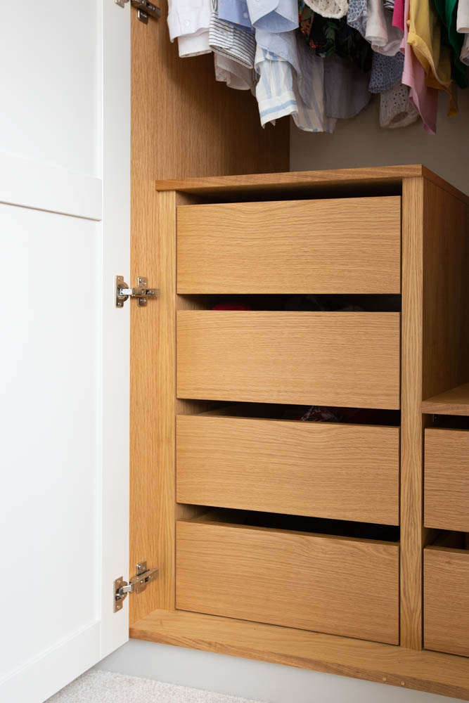 - Oak Interior Linings: Natural oak grain used inside wardrobes and drawers, bringing texture and warmth
